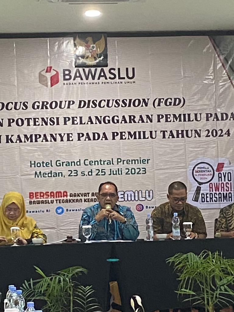 Medan, Bawaslu Sumut- Ketua Bawaslu Provinsi Sumatera Utara M Aswin Diapari Lubis yang baru dilantik bersama 6 (enam) anggota Bawaslu Provinsi Sumatera Utara pada hari Senin (17/07/2023) memberikan kata sambutan dalam pembukaan acara FGD (Focus Group Discussion) bertajuk “Pemetaan Potensi Pelanggaran Pemilu pada Tahapan Kampanye Pemilu Tahun 2024â€, yang diselenggarakan oleh Bawaslu RI di Grand Central Premier Hotel Medan pada Minggu (23/07/2023).