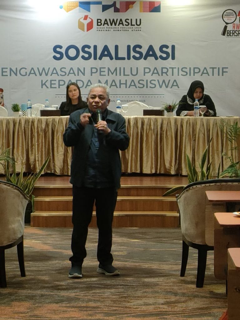 Medan, Bawaslu Sumut- Anggota Bawaslu Sumut Suhadi Sukendar Situmorang mengajak mahasiswa untuk berperan aktif dalam pengawasan Pemilu melalui pengawasan partisipatif. Hal itu disampaikannya pada kegiatan Sosialisasi Pengawasan Partisipatif kepada mahasiswa yang berasal dari berbagai kampus di Medan pada Kamis (23/11/2023).