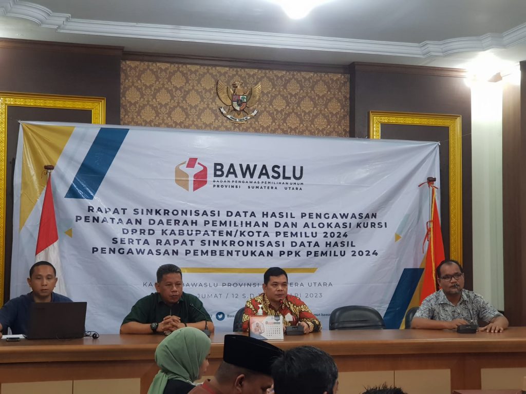 Medan, Bawaslu Sumut- Tahapan Penataan dan Penetapan Dapil DPRD Kabupaten/Kota yang diselenggarakan oleh KPU saat ini tengah berlangsung hingga tanggal 9 Februari 2023 mendatang. Bawaslu sebagai lembaga pengawas pemilu sejauh ini telah melaksanakan pengawasan terhadap pelaksanaan tahapan tersebut. Bawaslu Provinsi Sumatera Utara melalui Bawaslu Kabupaten/Kota telah memperoleh laporan hasil pengawasan dan hasil analisis Rancangan Penataan Daerah Pemilihan dan Alokasi Kursi DPRD di 33 Kabupaten/Kota se-Sumatera Utara. Laporan dan Hasil Analisis tersebut menjadi bahan pelaksanaan kegiatan rapat Sinkronisasi Data Hasil Pengawasan Rancangan Penataan Daerah Pemilihan dan Alokasi Kursi DPRD Kabupaten/Kota yang digelar di Hotel Antares Medan, Kamis (12/01/2023).