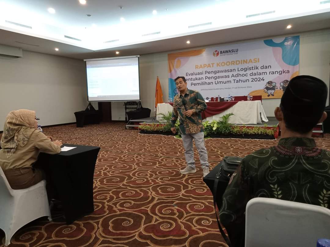 Deli Serdang_Bawaslu Sumut- Anggota Bawaslu Sumut Suhadi Sukendar Situmorang meminta Bawaslu Kabupaten/Kota untuk membuatkan catatan hasil pengawasan logistik Pemilu 2024 yang telah dilaksanakan. Demikian disampaikannya pada Rapat Koordinasi Pengawasan Logistik dan Pembentukan Pengawas Adhoc di D'Prime Kualanamu Deli Serdang pada Senin (18/3/2024).