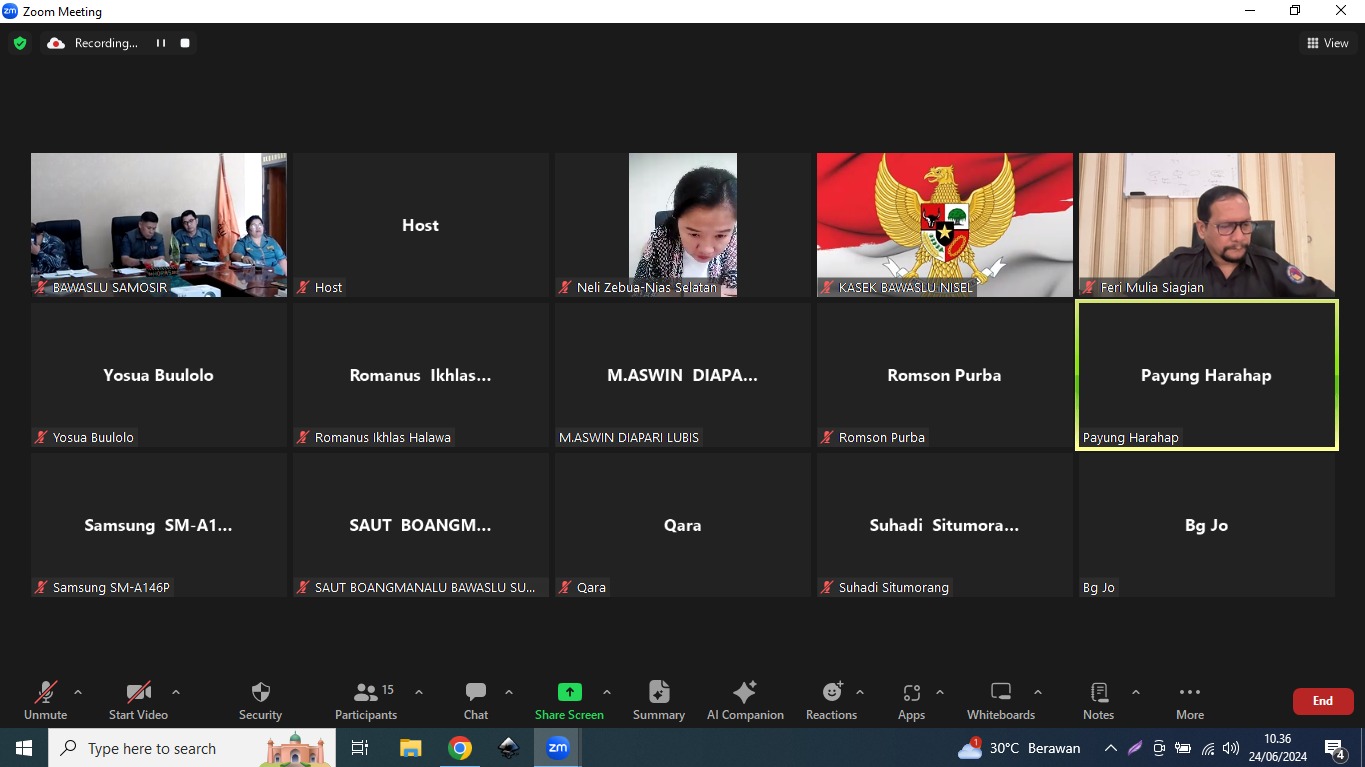 Medan, Bawaslu Sumut - Bawaslu Provinsi Sumatera Utara melaksanakan Rapat Koordinasi Kesiapan Administrasi dan Teknis Pelaksanaan Pemilihan Suara Ulang (PSU) di Kabupaten Samosir dan Kabupaten Nias Selatan yang dilaksanakan secara daring melalui zoom pada Senin (24/06/2024)