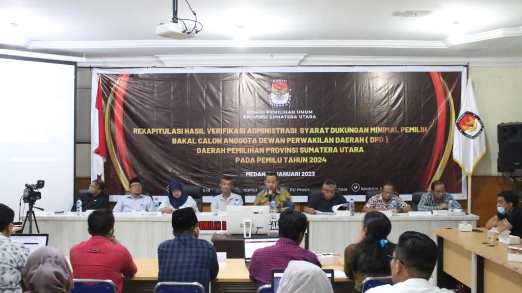 Medan, Bawaslu Sumut- Verifikasi administrasi terhadap syarat dukungan minimal pemilih bakal calon Anggota DPD Provinsi Sumatera Utara yang berlangsung sejak tanggal 30 Desember 2022 sampai dengan 12 Januari 2023 dan diperpanjang hingga paling lama 1 (satu) hari sebelum dimulainya tahapan perbaikan dan penyerahan dukungan minimal pemilih perbaikan kesatu telah selesai dilaksanakan dan diawasi oleh Bawaslu Kabupaten/Kota se-Sumatera Utara serta Bawaslu Provinsi Sumatera Utara. Hasil verifikasi administrasi dari KPU Kabupaten/kota tersebut direkapitulasi oleh KPU Provinsi Sumatera Utara melalui Rapat Pleno Terbuka Rekapitulasi Dukungan Bakal Calon Anggota Dewan Perwakilan Daerah Hasil Verifikasi Administrasi yang dilaksanakan di Kantor KPU Provinsi Sumut, Senin (11/01/2023).