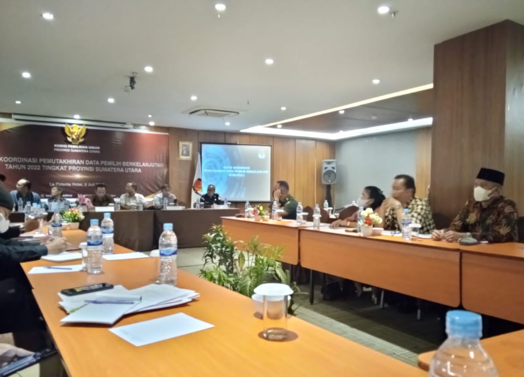 Medan, Bawaslu Sumut - Bawaslu Provinsi Sumatera Utara yang diwakili oleh Kordinator Divisi Hukum & Datin Henry Simon Sitinjak dan Kordinator Divisi Humas Marwan beserta staf divisi Hukum & Datin dan staf Divisi Pengawasan menghadiri Rapat Kordinasi Pemutakhiran Data Pemilih Berkelanjutan Tahun 2022 untuk Semester I yang diselenggarakan oleh KPU Provinsi Sumatera Utara pada Rabu, 06 Juli 2022 bertempat di Hotel Le Polonia Medan.