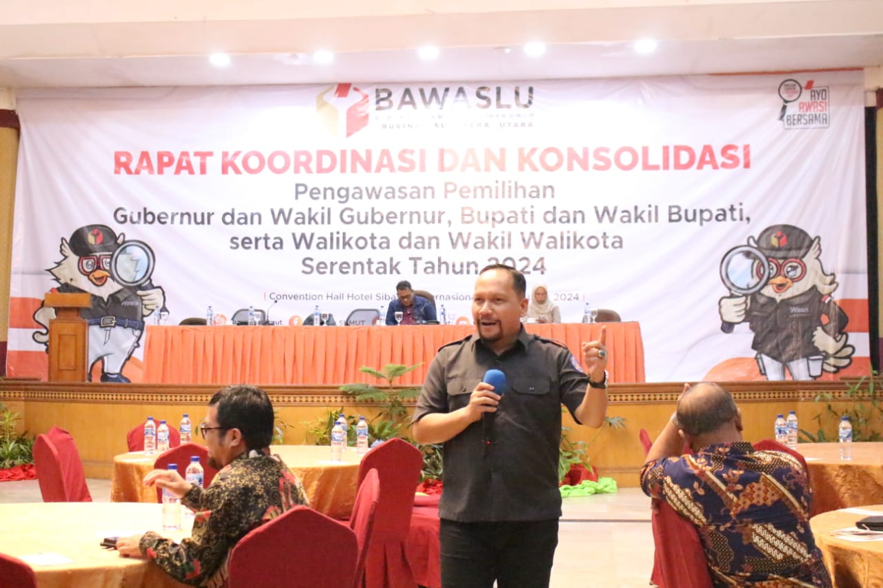 Karo, Bawaslu Sumut - Bawaslu Provinsi Sumatera Utara menggelar Rapat Koordinasi dan Konsolidasi Pengawasan Pemilihan Gubernur dan Wakil Gubernur, Bupati dan Wakil Bupati, serta Walikota dan Wakil Walikota Serentak Tahun 2024.