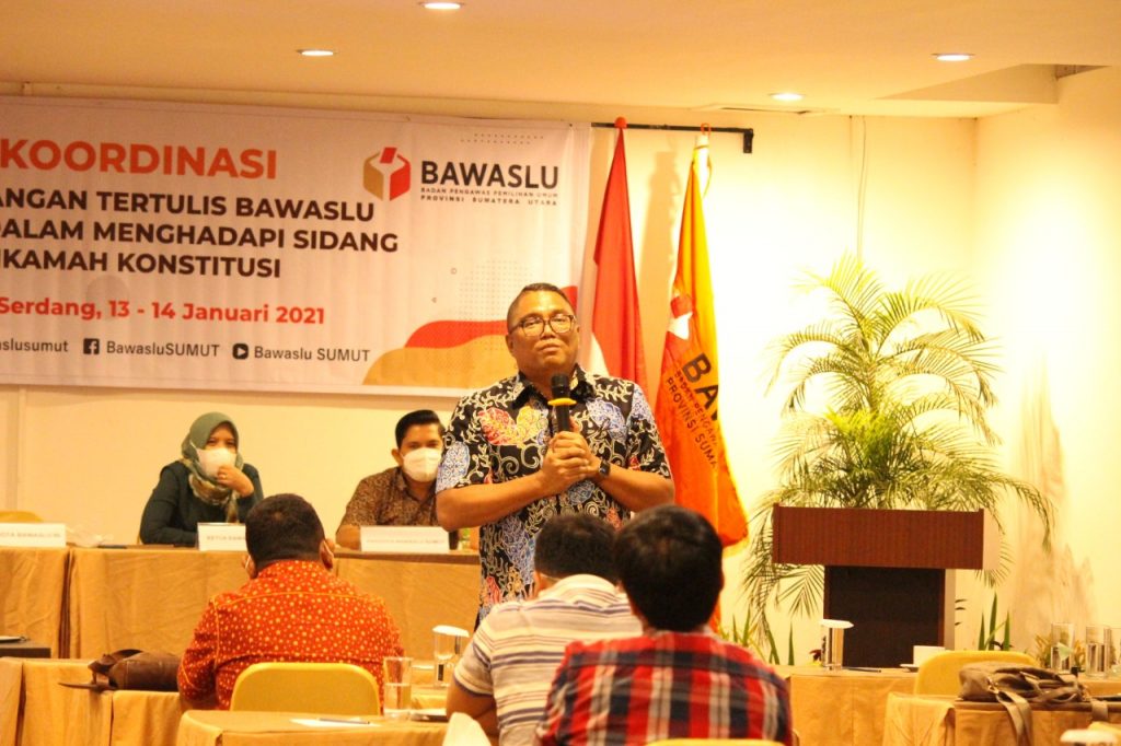 "Salah satu hal yang sering menjadi pertanyaan majelis adalah terkait penanganan pelanggaran. Dokumen kajian masuk sebagai bukti, dan pastikan isi kajian sama dengan kesimpulan," kta Fritz Edward Siregar saat memberikan arahan di acara Rapat Kordinasi Finalisasi Keterangan Tertulis Bawaslu Kabupaten/Kota Dalam Menghadapi Sidang PHP di Mahkamah Konstitusi (MK) yang diselenggarakan di Thong's Inn Kabupaten Deli Serdang, Rabu (13/1/2021).