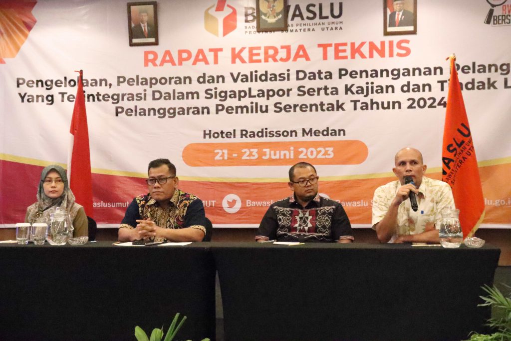Medan, Bawaslu Sumut- Dalam rangka penguatan jajaran sekretariat terkait pengelolaan data dan proses penanganan pelanggaran, Bawaslu Sumut gelar Rapat Kerja Teknis (Rakernis) Pengelolaan, Pelaporan dan Validasi Data Penanganan Pelanggaran yang Terintegasi Dalam SigapLapor Serta Kajian dan Tindak Lanjut Pelanggaran Pemilu Serentak tahun 2024 pada Rabu (21/06/2023).