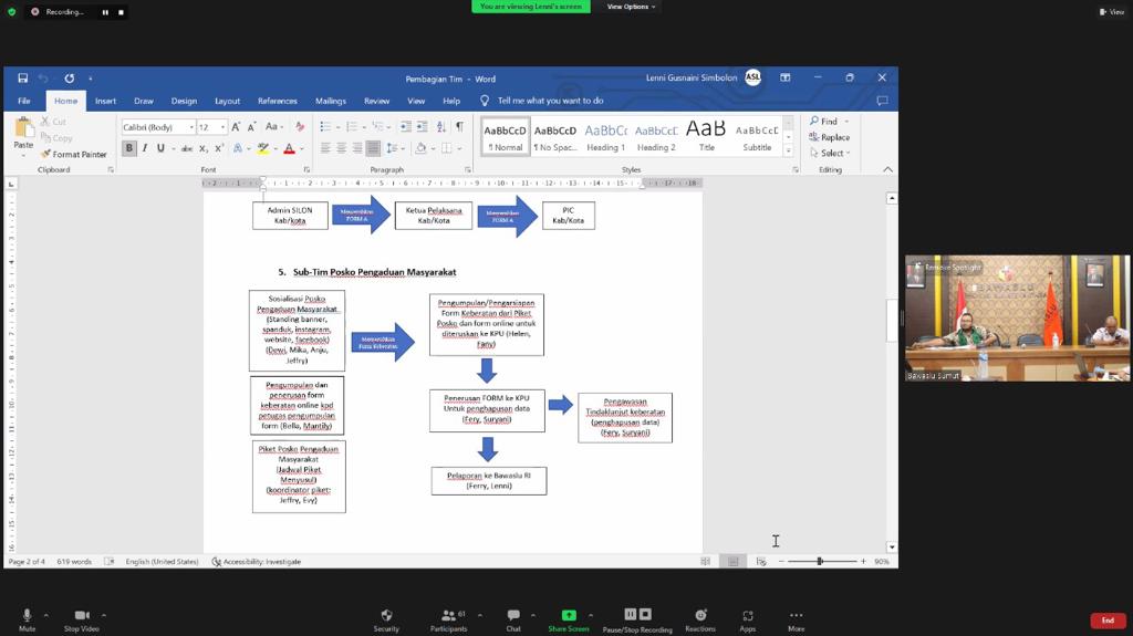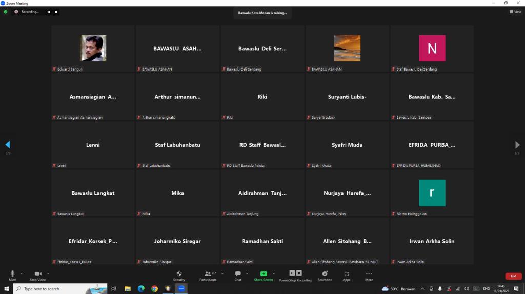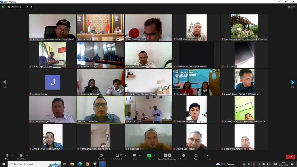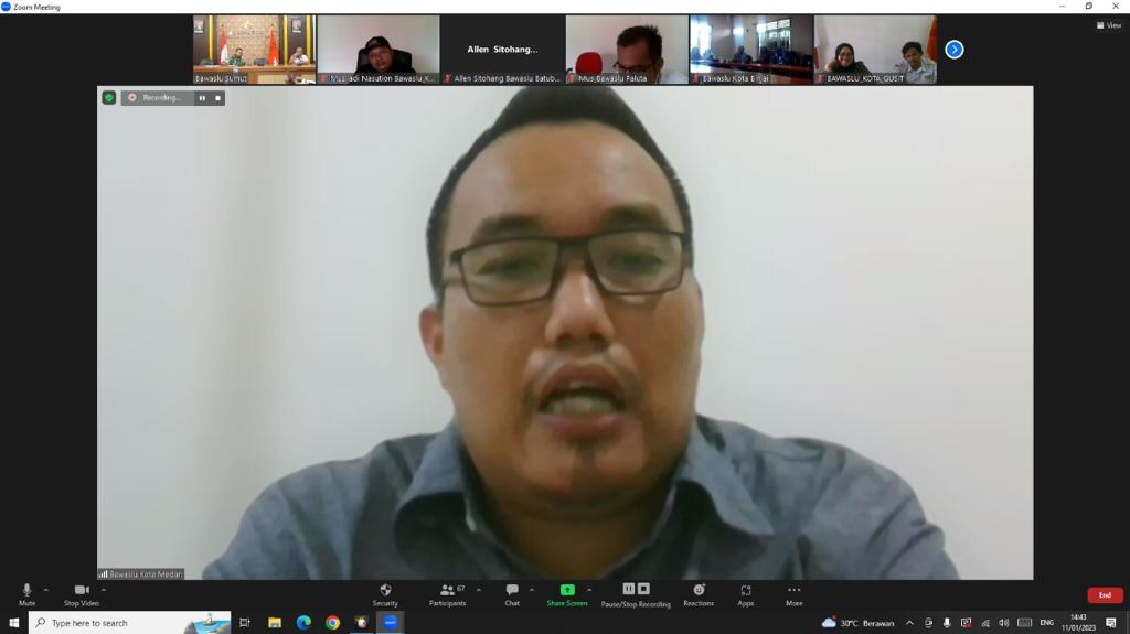 Medan, Bawaslu Sumut - Badan Pengawas Pemilihan Umum Provinsi Sumatera Utara melakukan rapat koordinasi Tim Fasilitasi Pengawasan Pencalonan Perseorangan Peserta Pemilihan Umum Anggota DPD pada Pemilu Tahun 2024 yang diselenggarakan secara daring dan diikuti oleh Ketua dan Anggota Bawaslu Kabupaten/Kota se-Sumatera Utara yang tergabung dalam Tim Fasilitasi Pengawasan Pencalonan Perseorangan Peserta Pemilihan Anggota DPD pada Pemilu tahun 2024 di masing-masing Kabupaten/Kota pada Senin (11/01/2023).