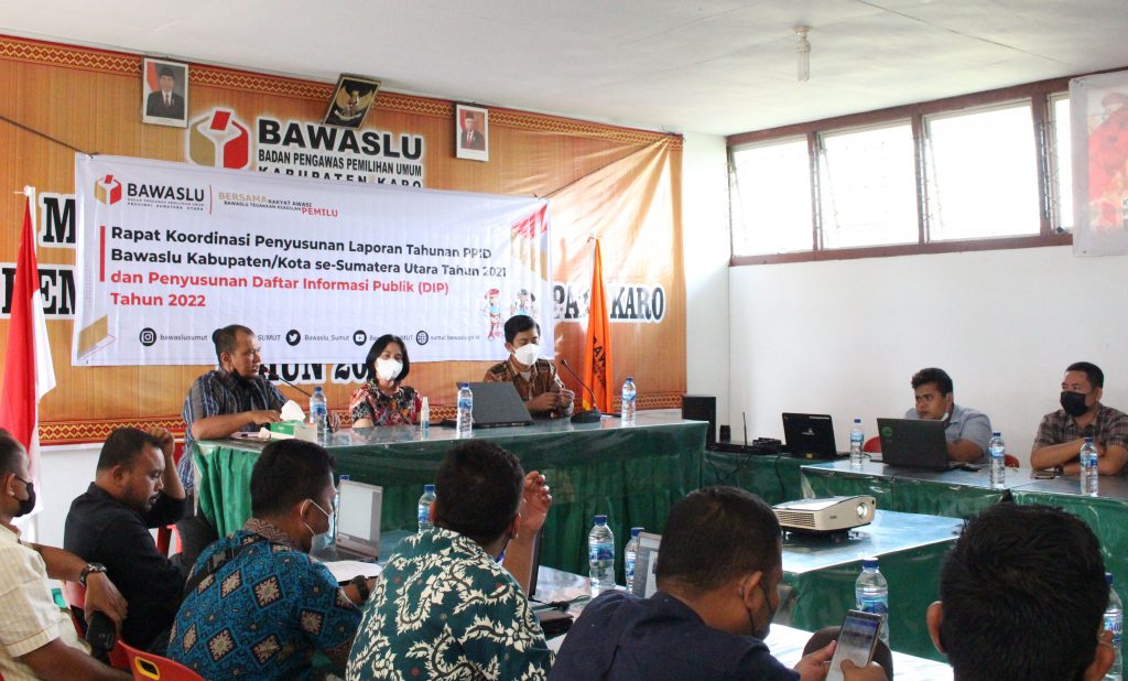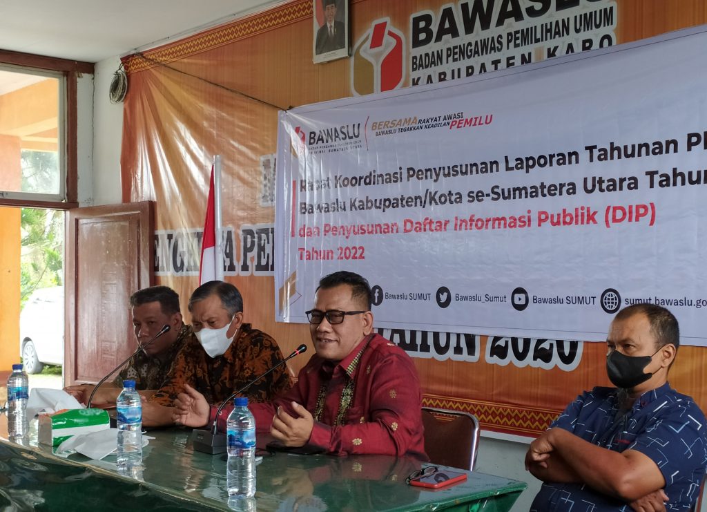 Karo, Bawaslu Sumut - Badan Pengawas Pemilihan Umum (Bawaslu) Sumatera Utara melaksanakan Rapat Koordinasi Penyusunan Laporan Tahunan PPID Bawaslu Kabupaten/Kota (Kab/Kota) se-Sumatera Utara Tahun 2021 dan Penyusunan Daftar Informasi Publik (DIP) Tahun 2022 yang dilaksanakan pada tanggal 23 s.d 24 Februari 2022 di Kantor Bawaslu Kabupaten Karo.