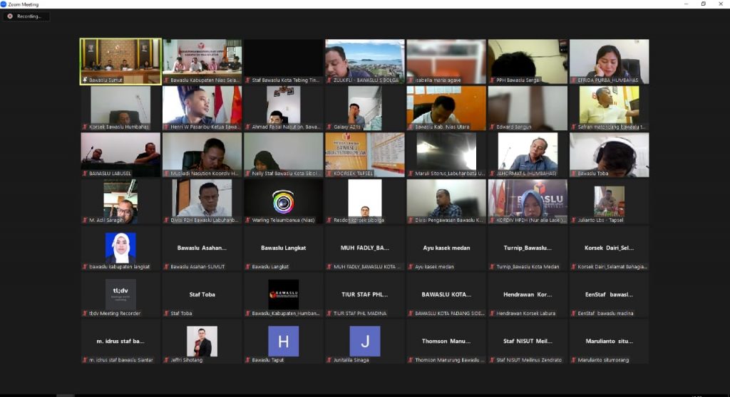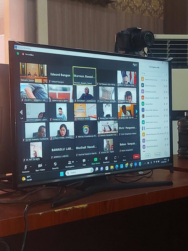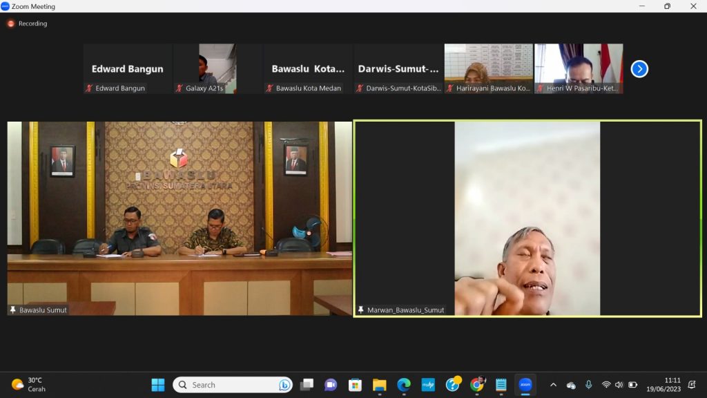 Medan, Bawaslu Sumut- Dalam rangka pengawasan rekapitulasi dan penetapan Daftar Pemilih Tetap (DPT) tingkat Kabupaten/Kota, Bawaslu Sumut menggelar Rapat Koordinasi Persiapan Pengawasan Rekapitulasi dan Penetapan DPT Pemilu 2024 bersama 33 Bawaslu Kabupaten/Kota secara daring melalui aplikasi Zoom Meeting pada Senin (19/06/2023).
