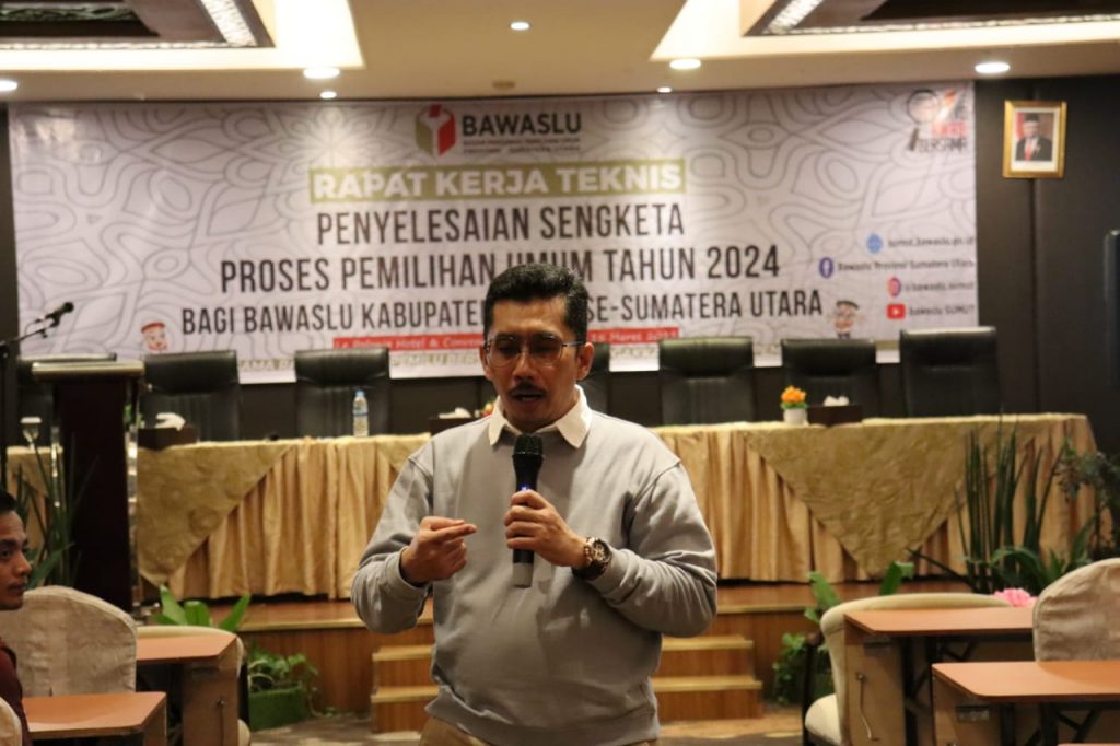 Herdi Munte menyampaikan tujuan kegiatan rakernis ini guna mempersiapkan jajaran pengawas pemilu dalam menghadapi sengketa proses pemilu ke depan.