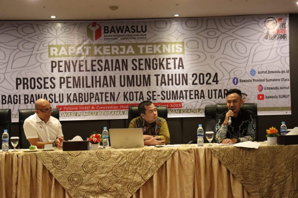 Medan, Bawaslu Sumut- Bawaslu Sumut gelar Rakernis Penyelesaian Sengketa proses pemilu bagi jajaran Bawaslu Kabupaten/Kota di Hotel Le Polonia Medan selama 3 hari yang dimulai sejak Senin (13/03/2023) dan dihadiri oleh 33 (tiga puluh tiga) Bawaslu Kabupaten/Kota se Sumatera Utara.