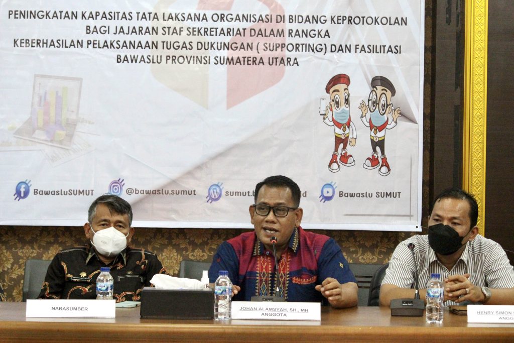 “Betapa pentingnya pemahaman keprotokolan bagi para staf demi terwujudnya pelayanan yang paripurna bagi Pimpinan Bawaslu Provinsi Sumatera Utara. Kehadiran staf yang mumpuni dalam mendukung dan memfasilitasi Pimpinan melaksanakan tugas-tugasnya merupakan tonggak penting dalam keberhasilan kinerja Bawaslu Provinsi Sumatera Utara,†Kata Kepala Sekretariat Bawaslu Sumut Feri Mulia Siagian , Kamis (13/01/2021) saat memberikan kata sambutan di kantor Bawaslu Sumut.