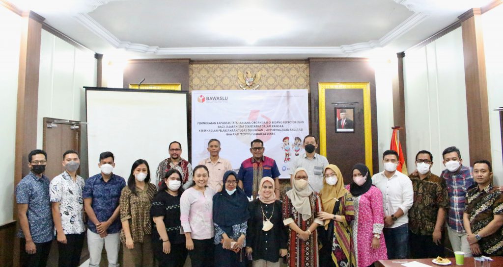 Medan, Bawaslu Sumut- Mengawali tahun 2022, Badan Pengawas Pemilihan Umum (Bawaslu) Provinsi Sumatera Utara melaksanakan Kegiatan Peningkatan Kapasitas Tata Laksana Organisasi di Bidang Keprotokolan bagi Jajaran staf Sekretariat dalam rangka Keberhasilan Pelaksanaan Tugas dukungan (Supporting) dan Fasilitasi Bawaslu Provinsi Sumatera Utara untuk meningkatkan kompetensi pegawai dalam melaksanakan tugas.