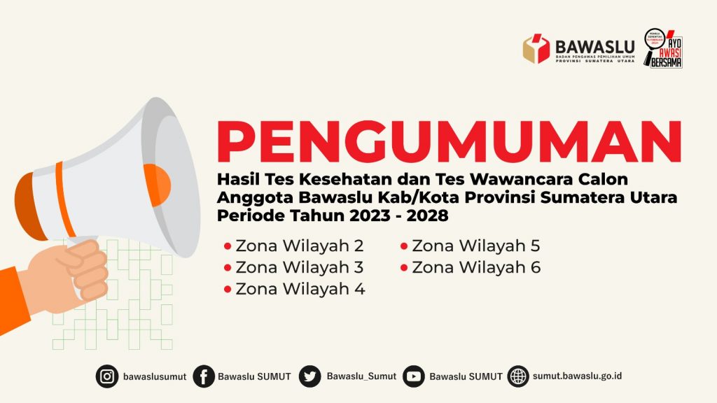 PENGUMUMAN HASIL TES KESEHATAN DAN TES WAWANCARA CALON ANGGOTA BAWASLU KABUPATEN/KOTA DI PROVINSI SUMATERA UTARA PERIODE TAHUN 2023 - 2028